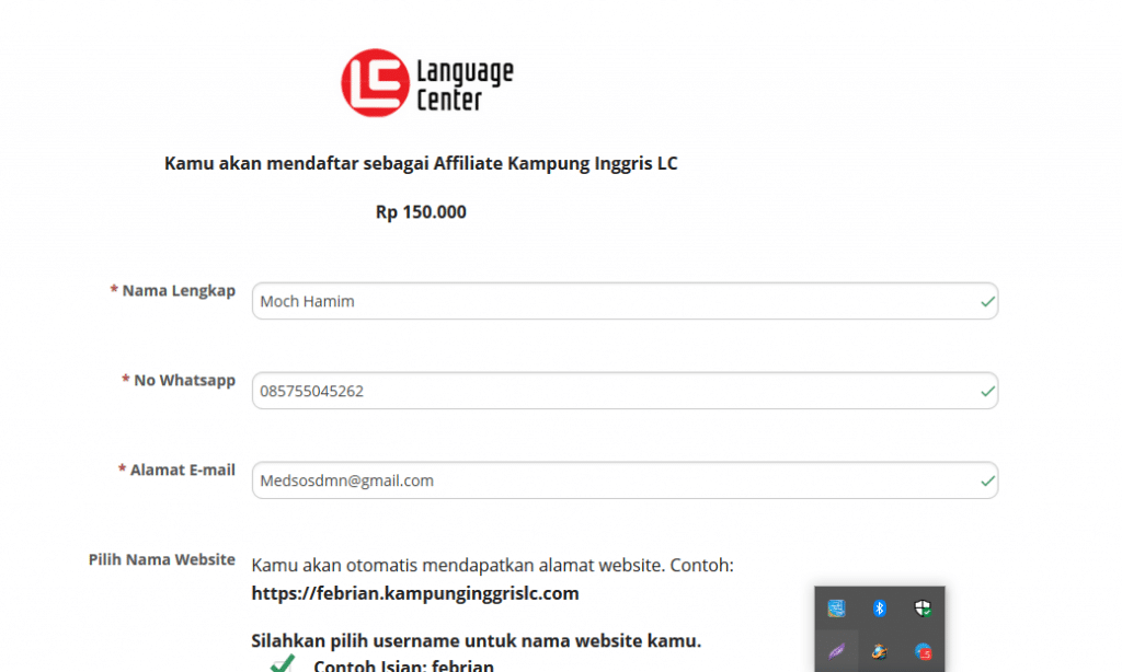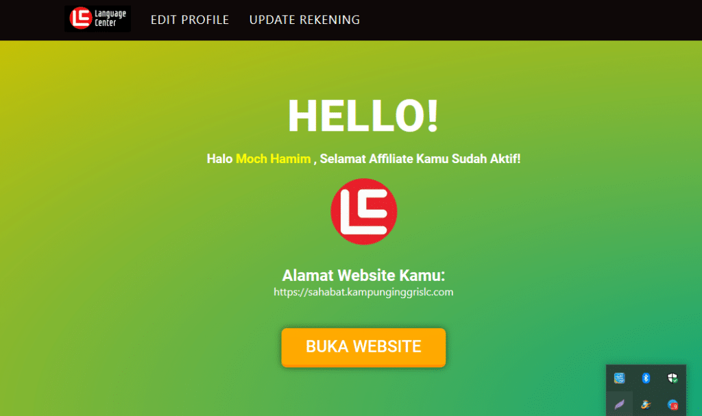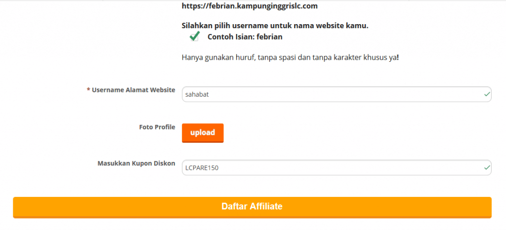 8. Alamat affiliate anda bisa diakses di usernameanda.kampunginggrislc.com